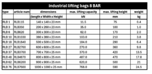 De gevulkaniseeerde hefkussens zijn verkrijgbaar in diverse afmetingen en in hefcapaciteit van 1 t/m 67 ton. In platte toestand zijn ze verkrijgbaar vanaf 22mm en opgeblazen zijn de hefhoogtes 80 t/m 520 mm.