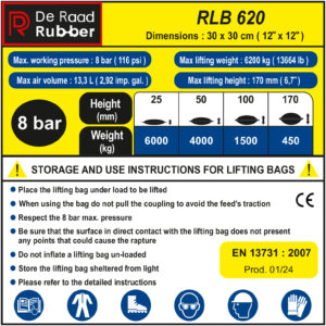 Het RLB 6 hefkussen is een gevulkaniseerd hefkussen. De afmetingen zijn: 300 x 300 x 23mm, het gewicht is 2 KG. De maximale hefcapaciteit bij 8 Bar bedraagt 62 KN ofwel ca. 6,3 Ton en de maximale hefhoogte is 170mm.